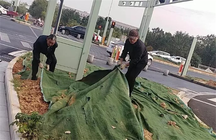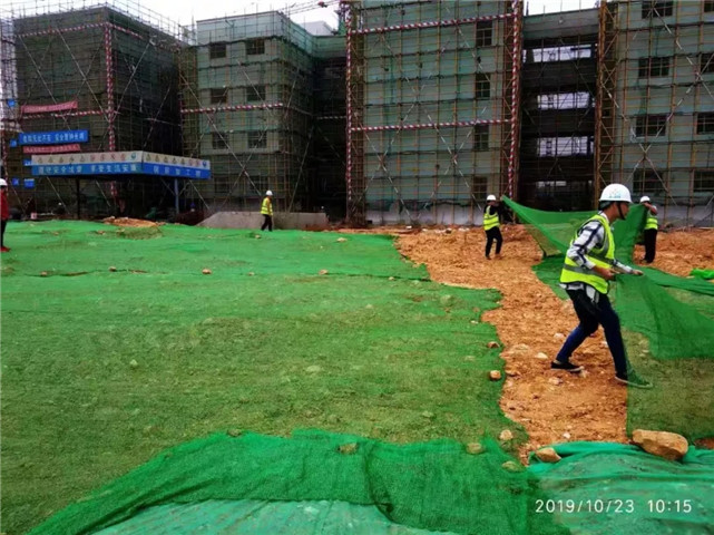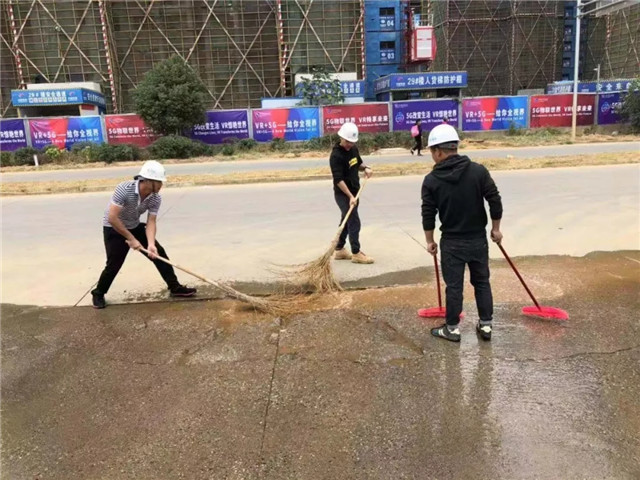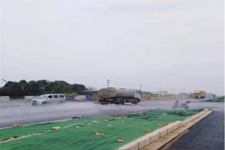 开启雾炮机降尘,组织工人清洗道路和种草区域人工洒水,补草种