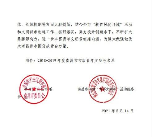 近日,共青团南昌市委、南昌市创建青年文明号活动组委会颁布了《关于命名2018—2019年度南昌市市级青年文明号的决定》(洪青联发〔2021〕17号)。其中,金开集团团委青年突击队被评为2018—2019年度南昌市“市级青年文明号”。